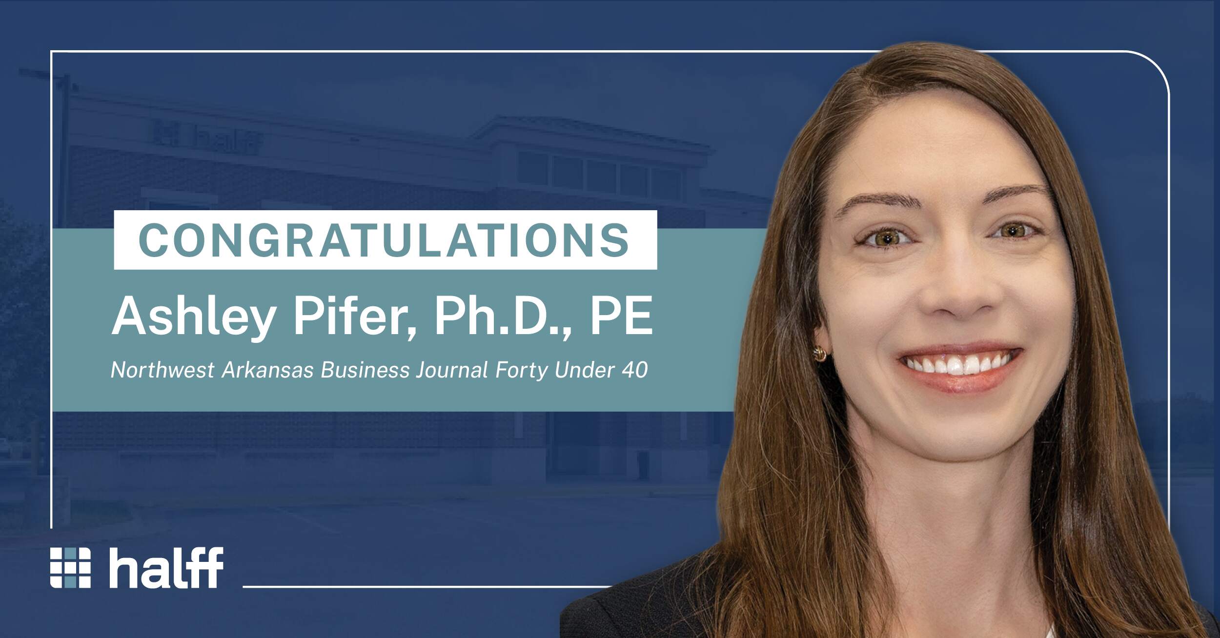 FAYETTEVILLE, Ark. — Halff Director of Water/Wastewater Ashley Pifer, Ph.D., PE, was recently selected as a Northwest Arkansas Business Journal (NWABJ) Forty Under 40 honoree.